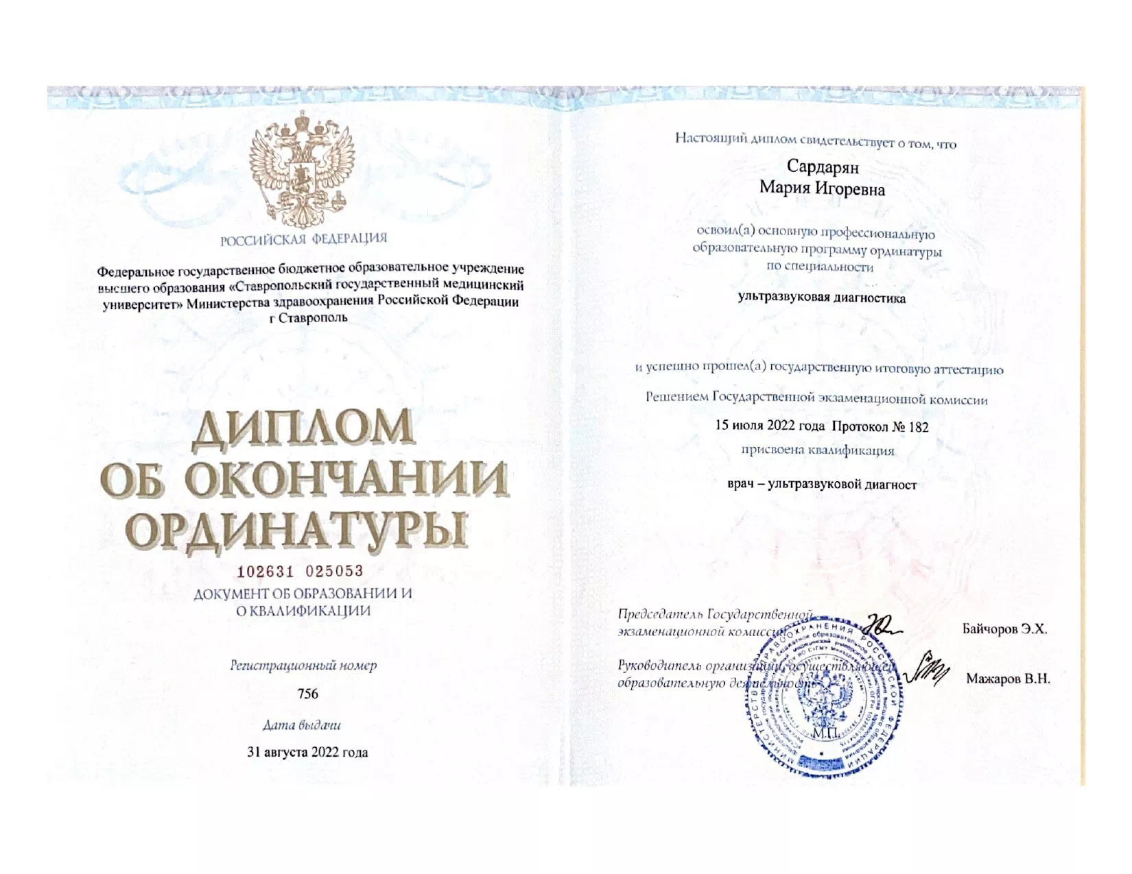 • 2022 — Ставропольский государственный медицинский университет (квалификация: врач-ультразвуковой диагност).